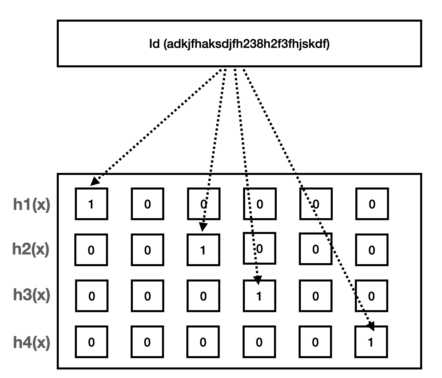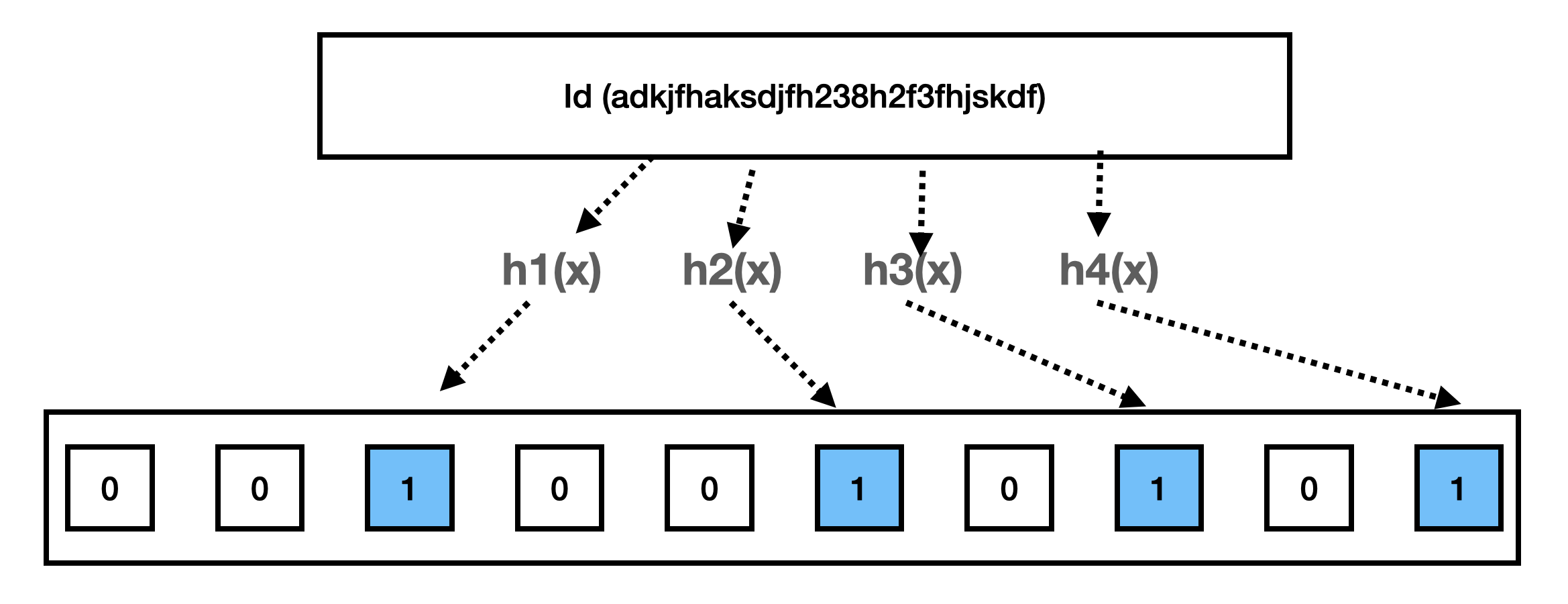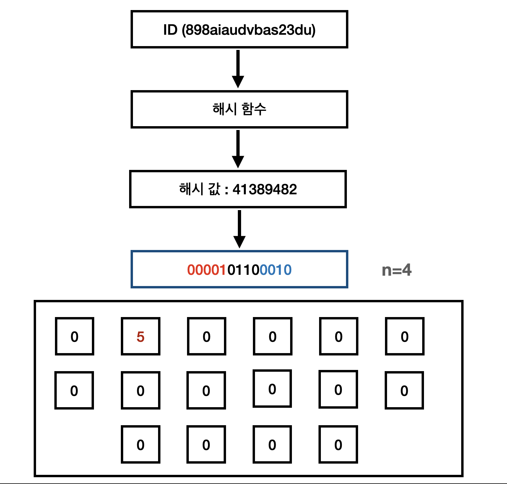 추출된 해시값을 인덱스로 하여 이진수 배열에 값이 0이면 1을 더하고 이미 1이라면 변경하지 않습니다.
