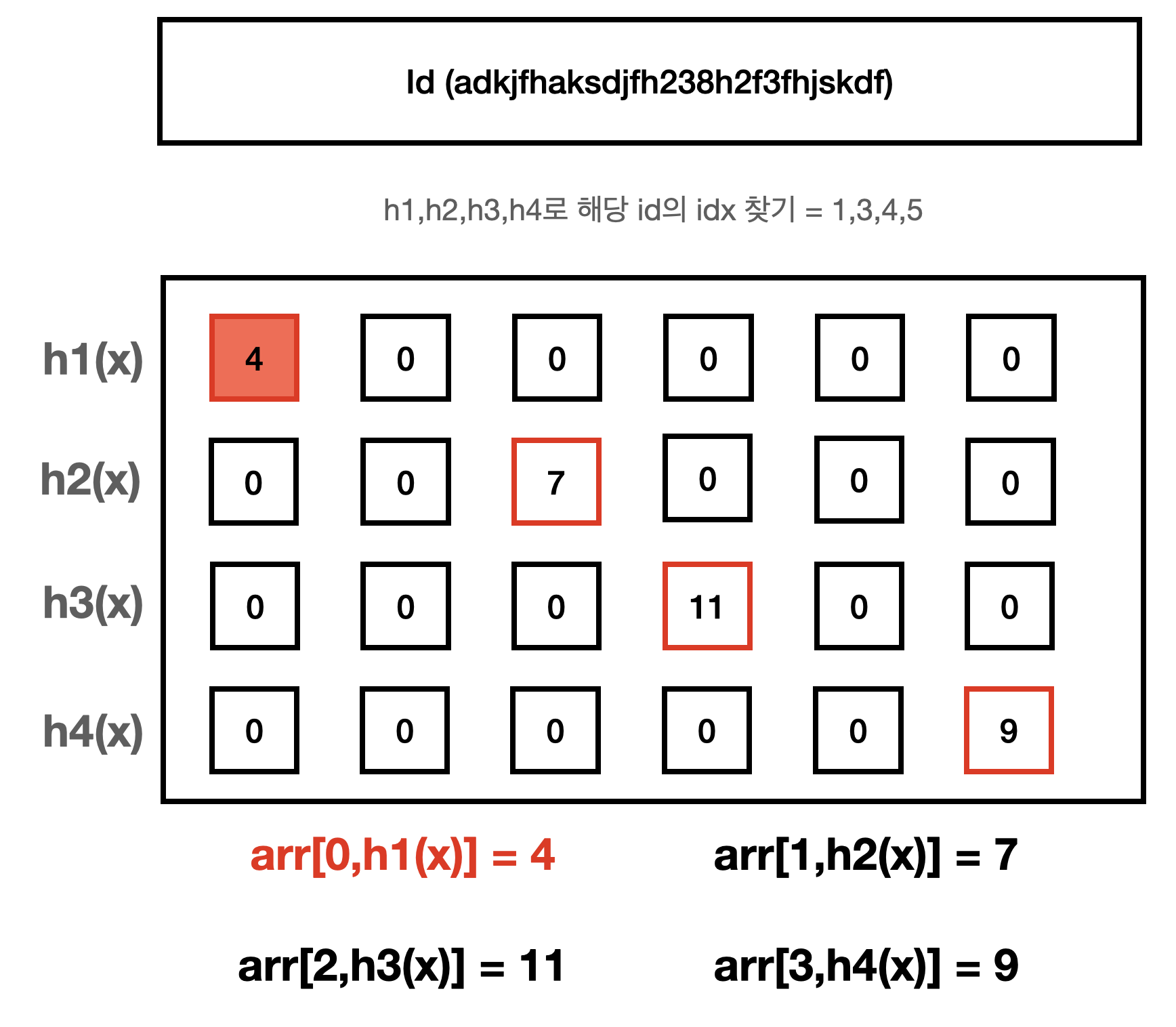 데이터가 들어온 수를 조회할때는 데이터를 추가할때 사용했던 동일한 해시함수(h1,h2,h3,h4)를 사용해서 해당 데이터의 인덱스 값들을 찾습니다.