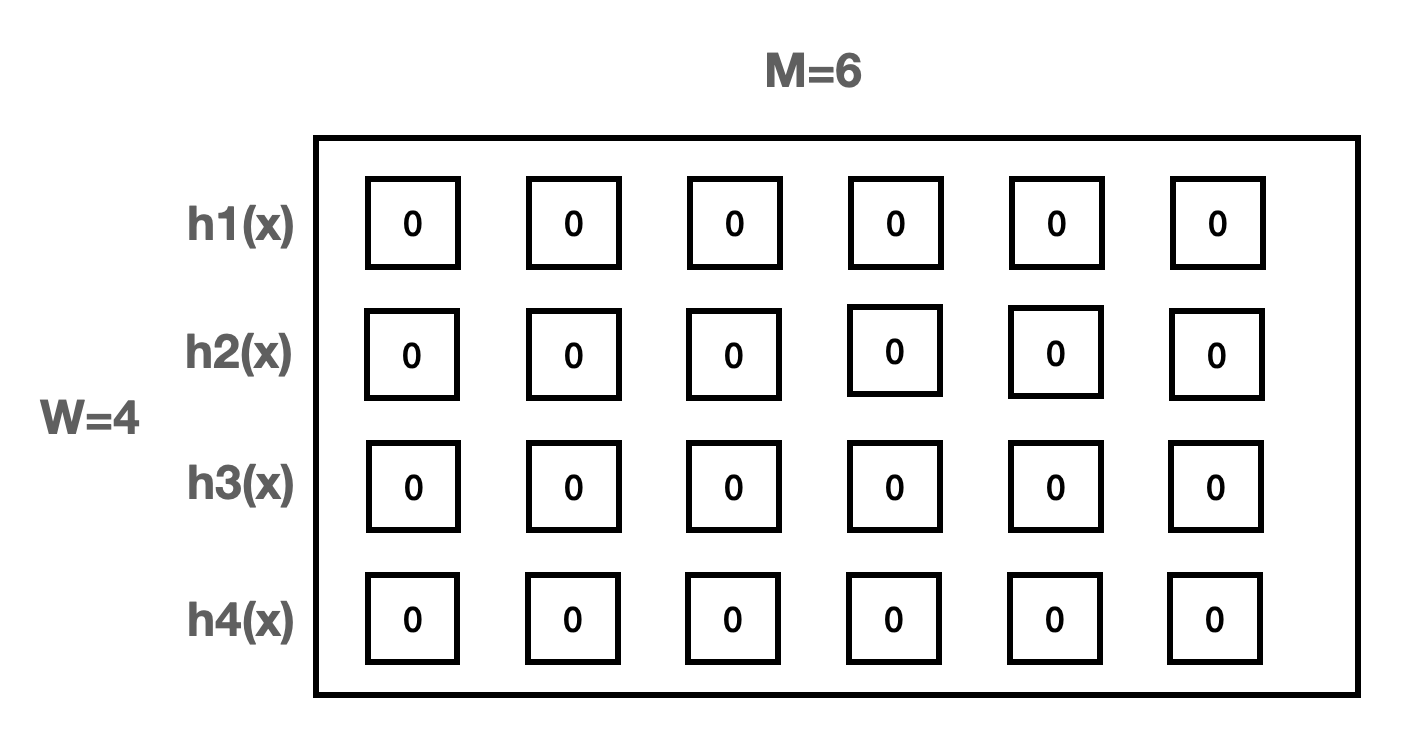 들어온 데이터를 각 해시함수에 넣어 정수값을 각각 추출하고 그 정수값을 인덱스로하여 행에 +1을 합니다.