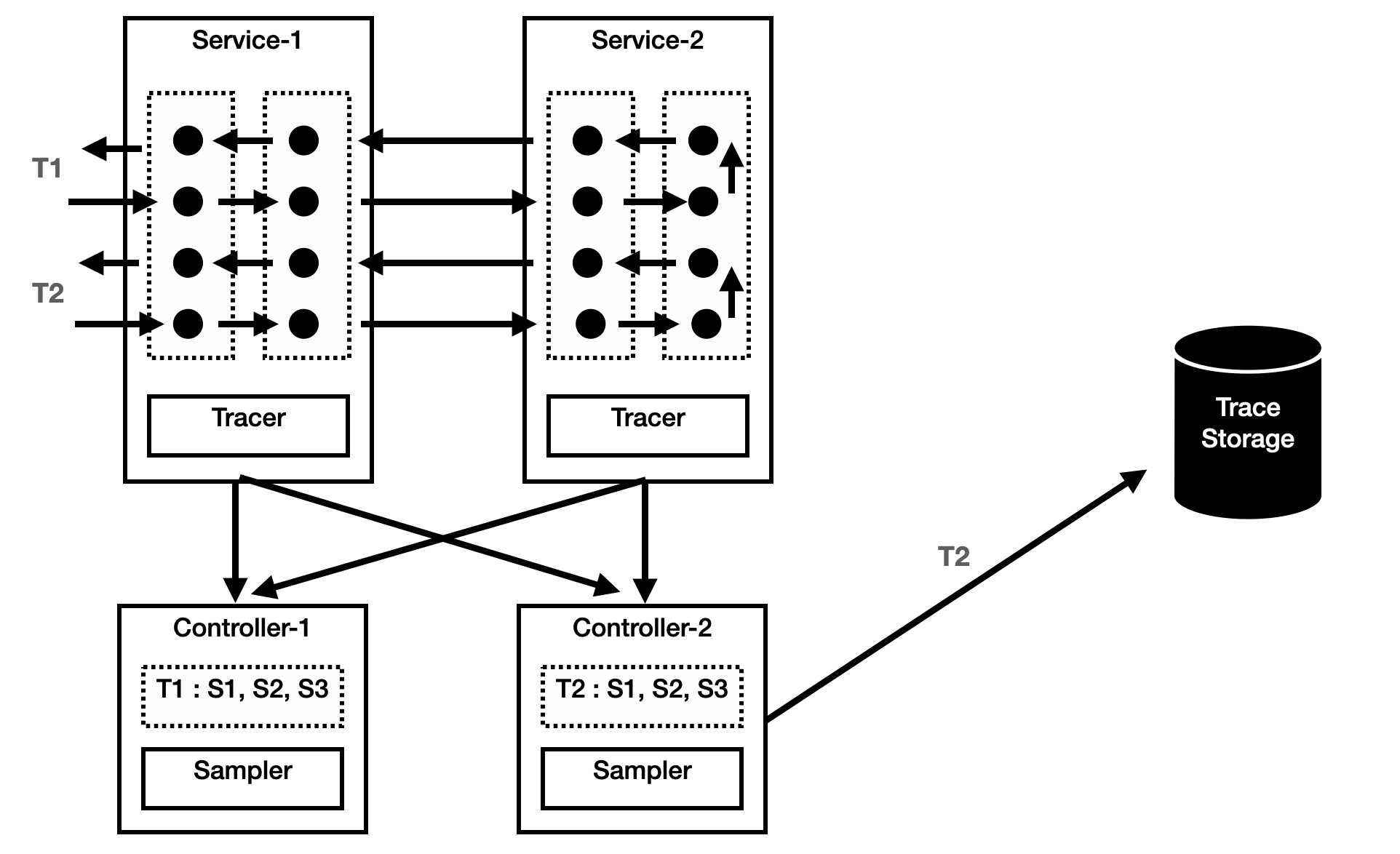 아래 그림은 2개의 마이크로서비스에서 2개의 요청 T1, T2를 테일기반으로 샘플링하는 상황입니다.