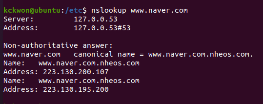 DNS서버를 이용하여 해당 호스트의IP주소를 확인 할 수 있습니다. host , dig명령과 동일합니다.
