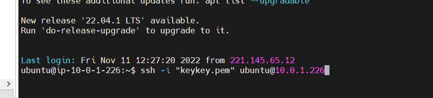 ssh -i "키파일" private-ip를 통해 ec2에 접근 하여