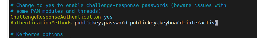 ChallengeResponseAuthentication : ChallengeResponse 허용 여부를 yes로 변경해줍니다.AuthenticationMethonds 명령어로 인증 순서를 명시해줍니다.