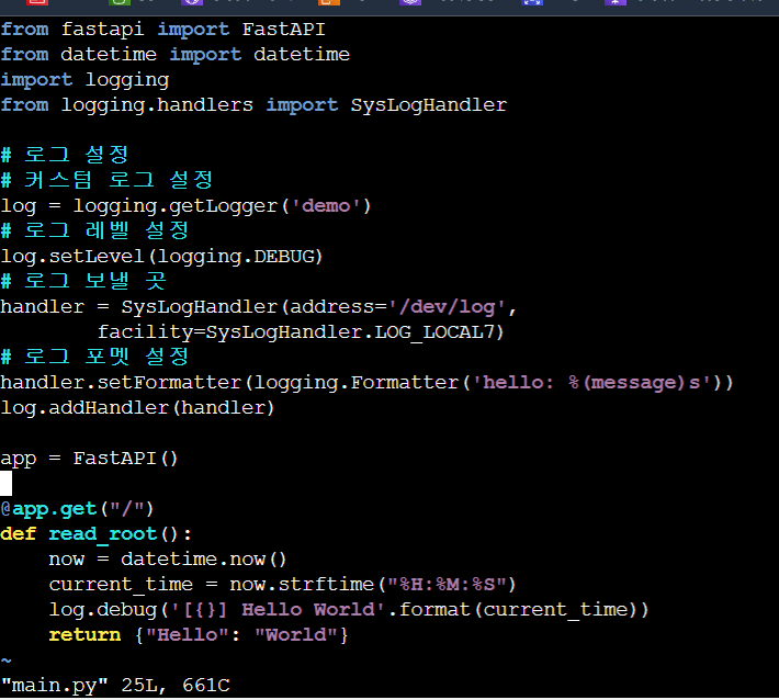 어플리케이션 소스에서 local7의 로그를 생성했으므로 해당 레벨의 모든 로그를 hello.log파일에 위치시킵니다.