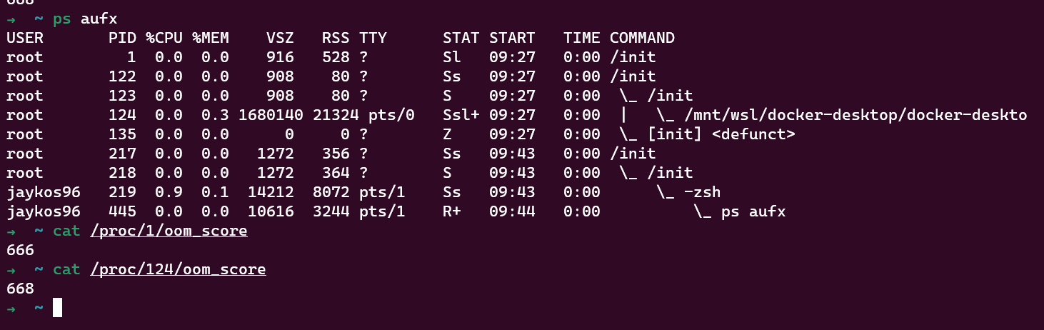 기본적으로 리눅스에서 1번 init프로세스는 0 의 oom_score값을 가집니다. (저는 wsl을 통해 조회해서 666이 나왔습니다.)