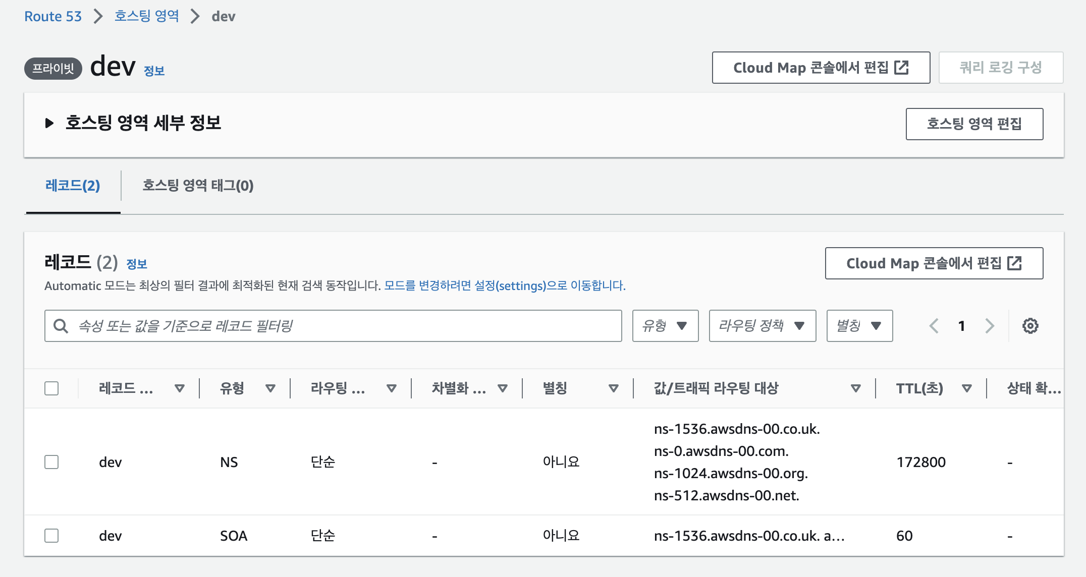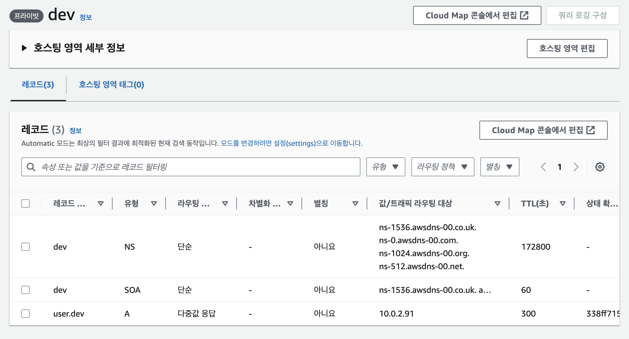 아니면 AWS 웹에 접속해서 만들어진 private-dns-namespace의 정보를 확인 할 수 있습니다.