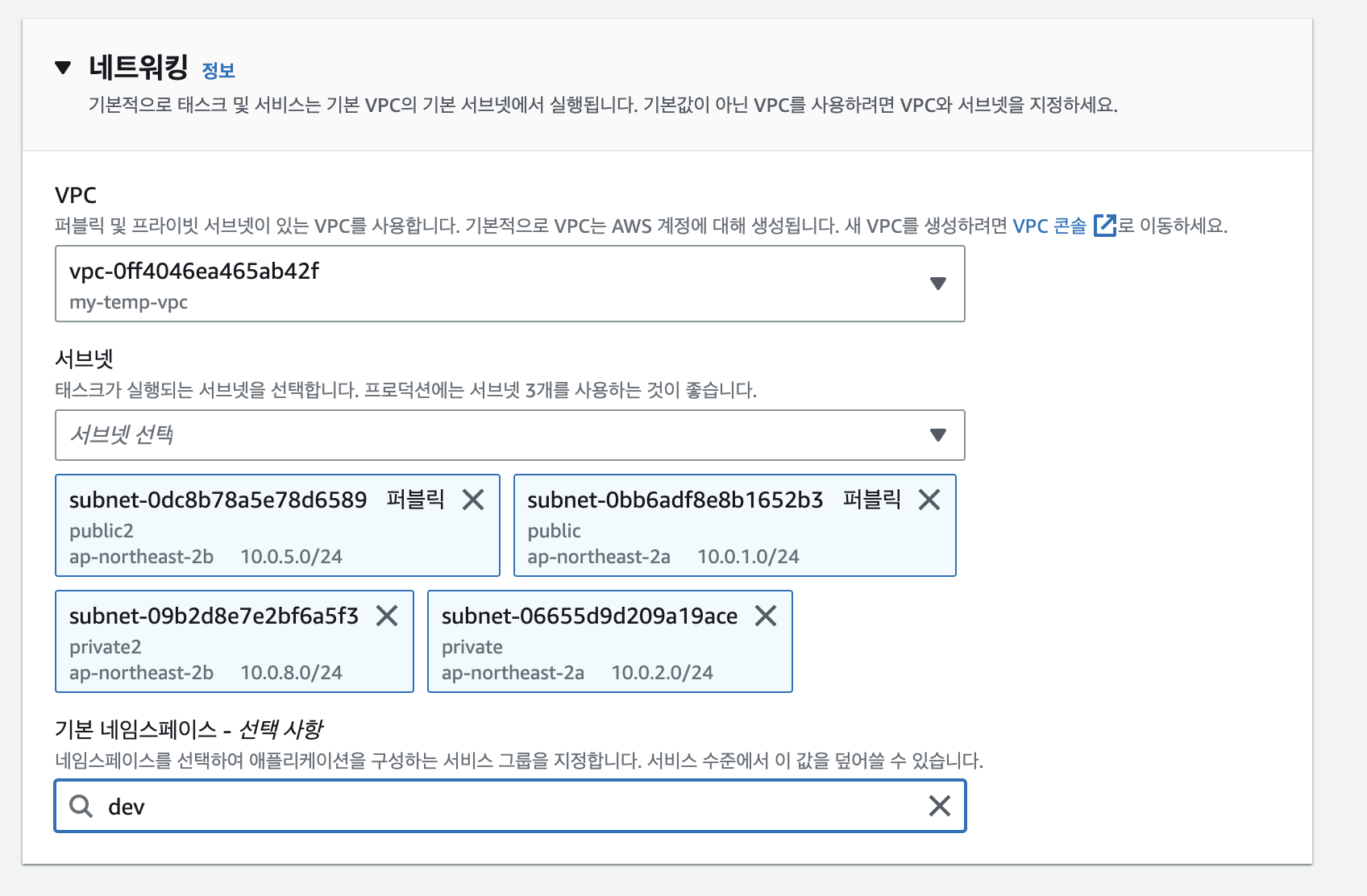 생성 시 앞서 만들어 두었던 private-dns-namespace를 지정합니다.