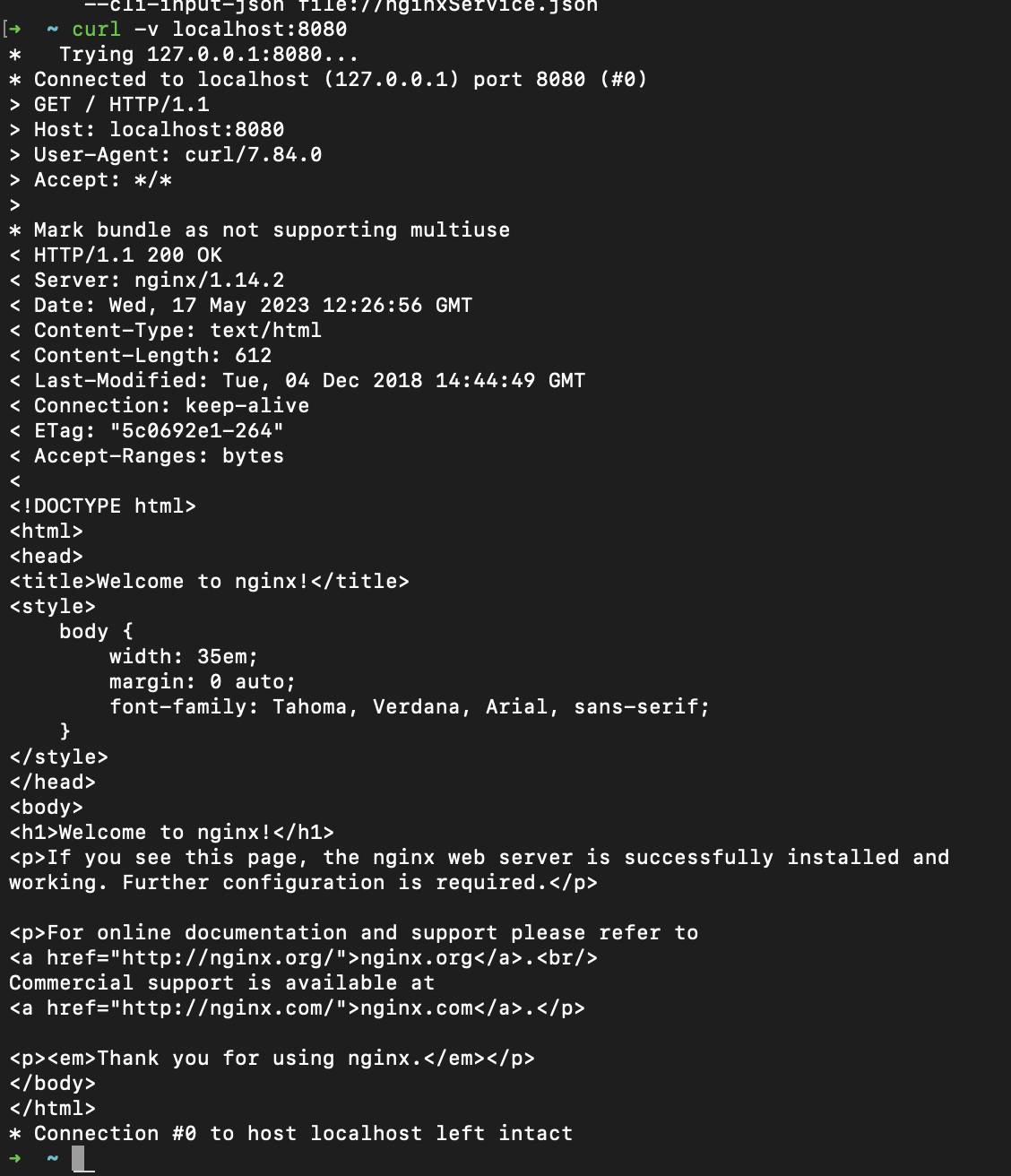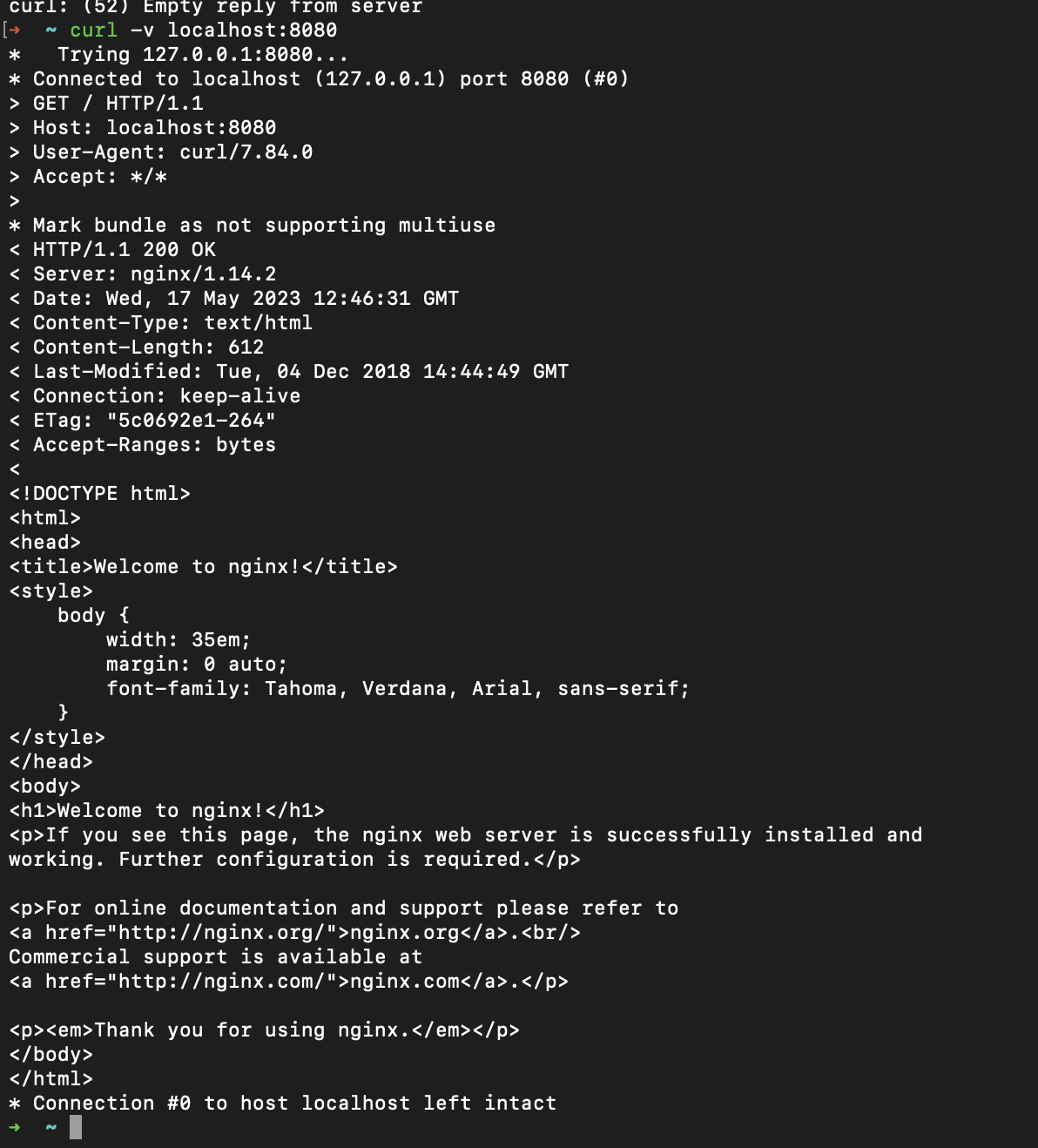 포트 포워딩 후 다른 터미널을 열어 curl요청을 보내 배포된 nginx이미지를 확인합니다.