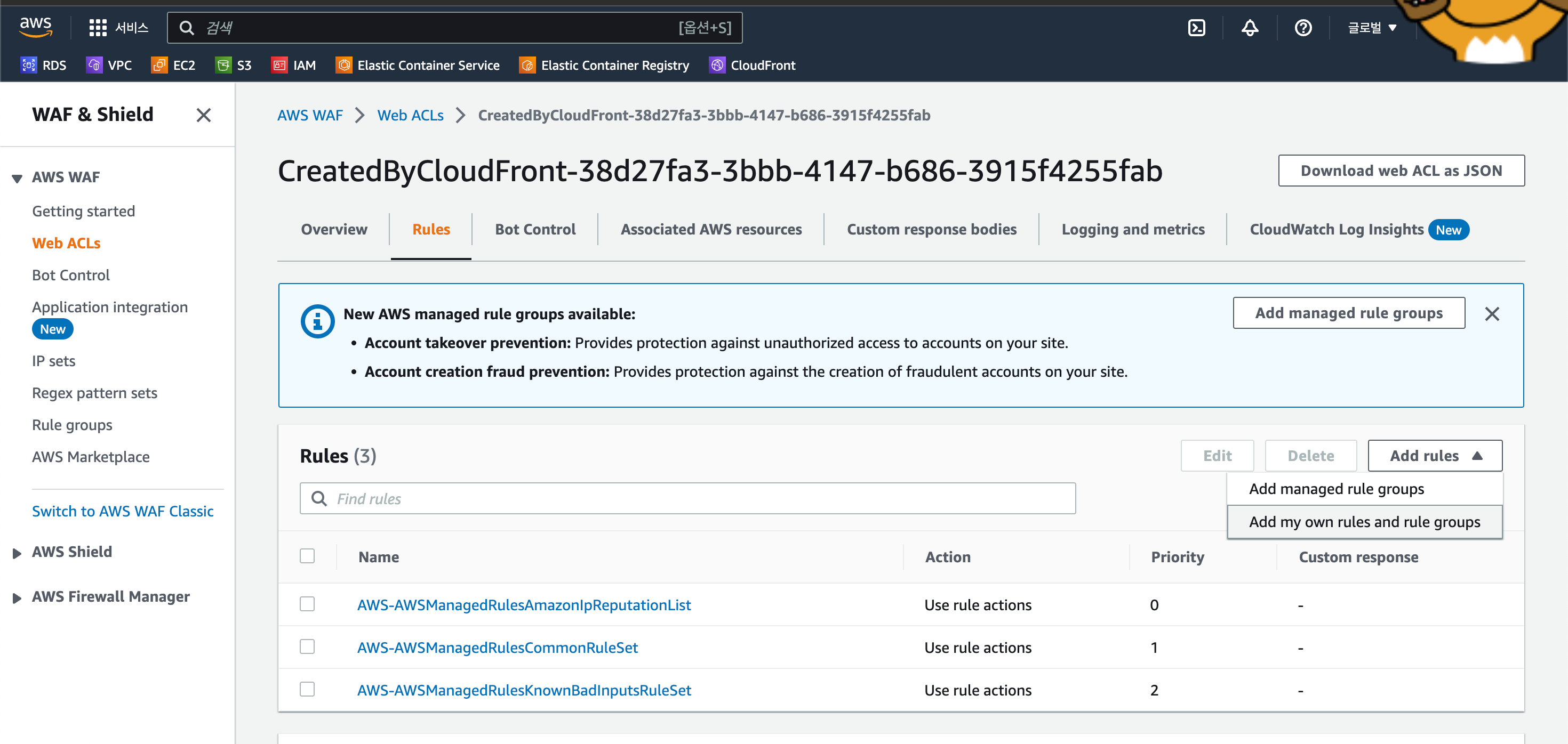 (저는 CloudFront에 대한 WAF를 지정하기에 CloudFront생성 시 함께 생성된 Web ACLs에 추가하였습니다.)