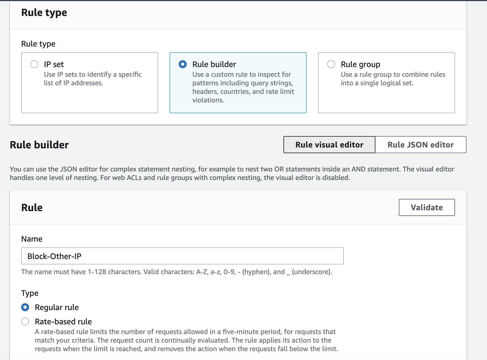 - AWS Management 콘솔에서 규칙 빌더를 이용하여 사용자 지정 규칙을 작성하거나, JSON 형태로 사용자 지정 규칙을 작성한 다음 AWS 명령줄 인터페이스(AWS CLI) 또는 AWS CloudFormation 같은 자동화 도구를 통해서도 지정 할 수 있습니다.