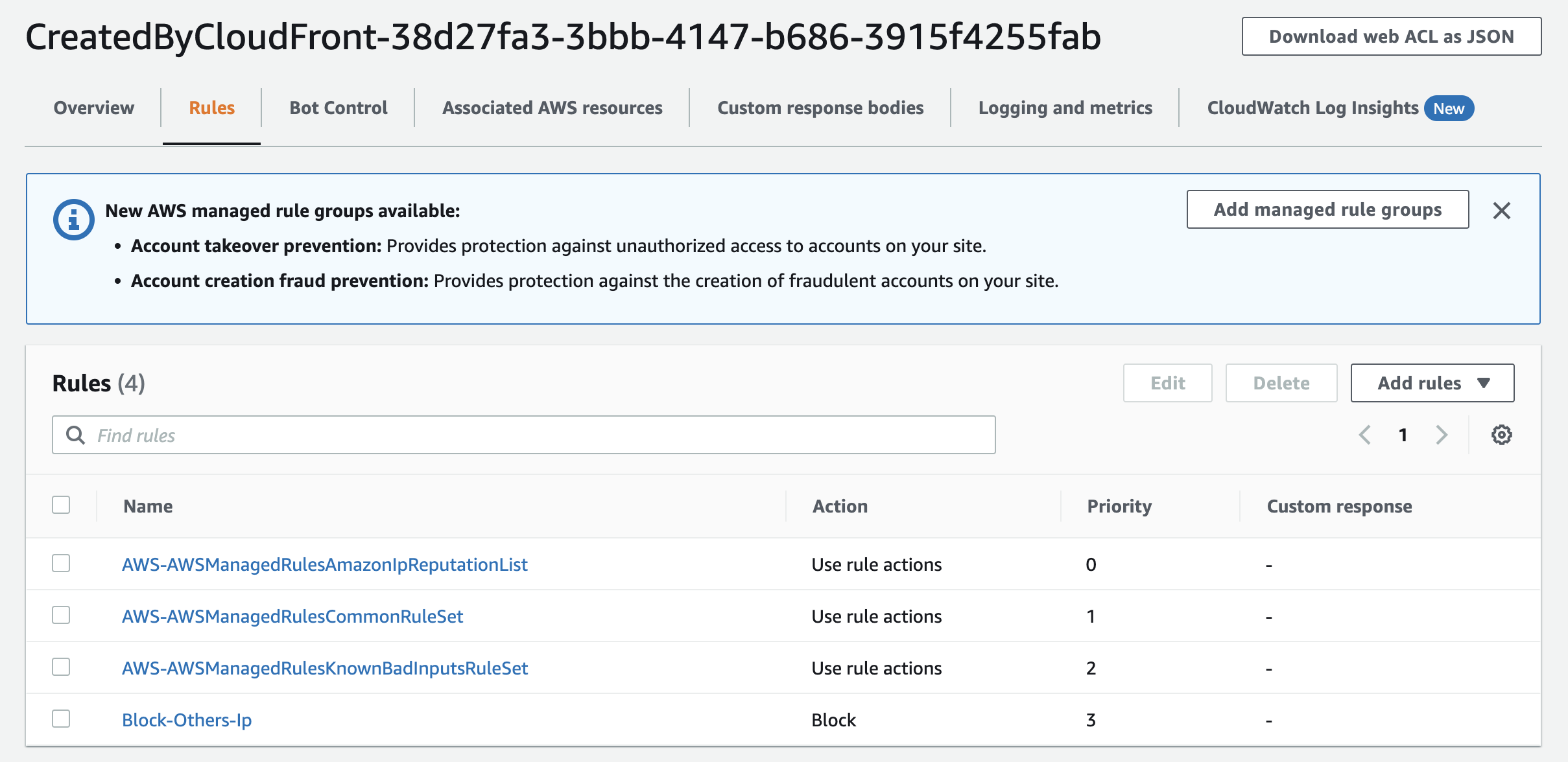 2. WEB ACL Custom Rules에 추가