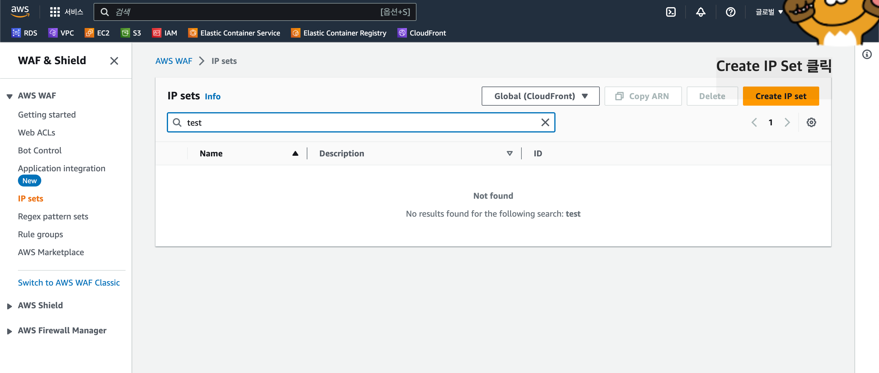 저는 CloudFront에 WAF를 설정하려하기에 Global 지역에 IP Set을 생성합니다.