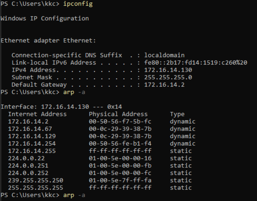 공격전 게이트웨이는 172.16.14.2 이고 mac주소는 00-50-56-f7-5b-fc입니다.