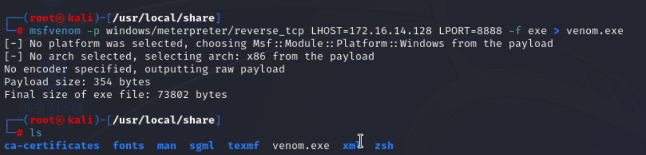 파일을 생성 후 ls 명령어로 확인해보면 지정한 이름으로 페이로드가 만들어져 있습니다.