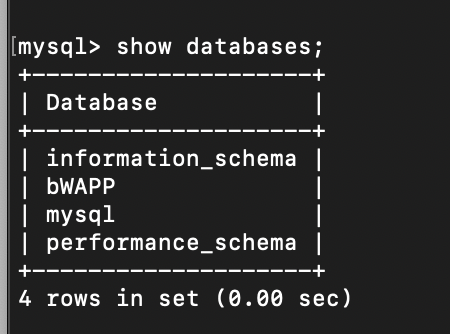 bWAPP 페이지에서 설치 후 bWAPP 컨테이너의 MYSQL에서 show databases; 명령어로 확인해보면