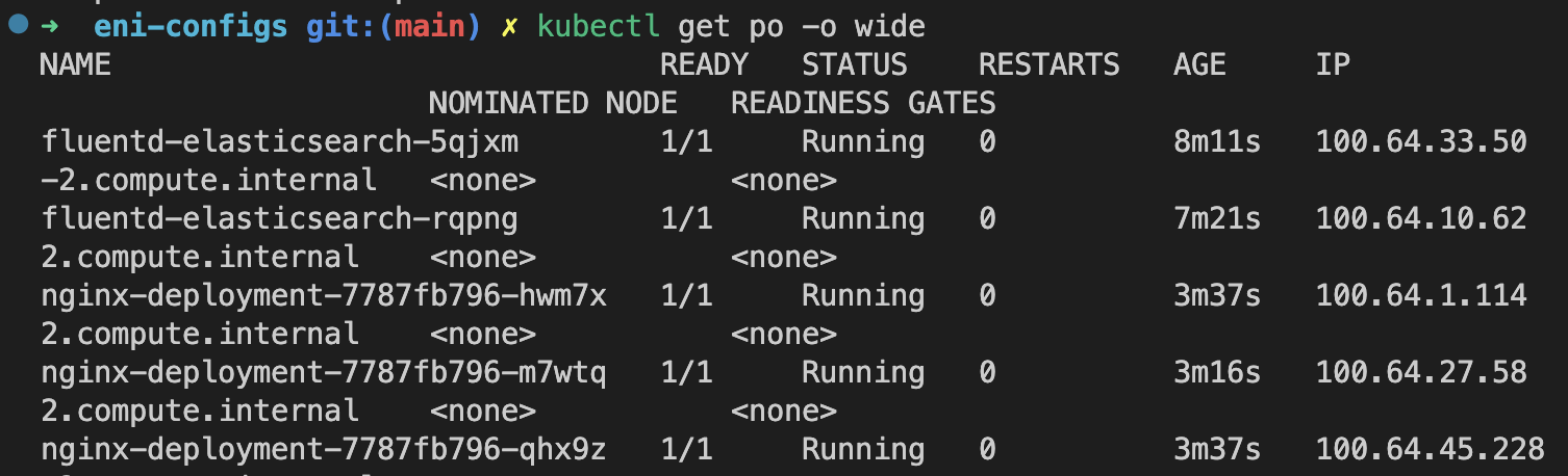 ENIConfig 객체는 하나의 서브넷과 보안 그룹 목록을 정의합니다. 노드에 단 하나의 ENIConfig 객체만 사용하여 주석을 달거나 레이블을 지정하면 해당 노드에 예약된 모든 포드는 해당 ENIConfig 객체에 정의된 서브넷과 보안 그룹을 사용합니다.