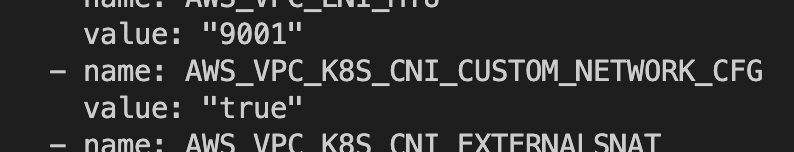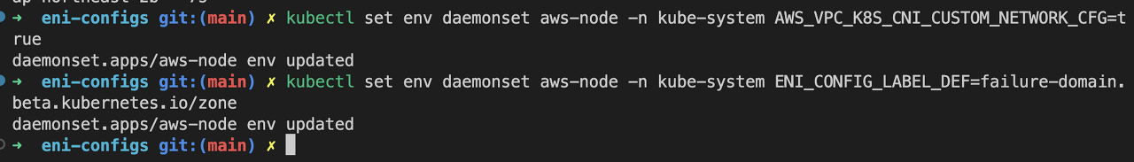 kubectl set env daemonset aws-node -n kube-system AWS_VPC_K8S_CNI_CUSTOM_NETWORK_CFG=true