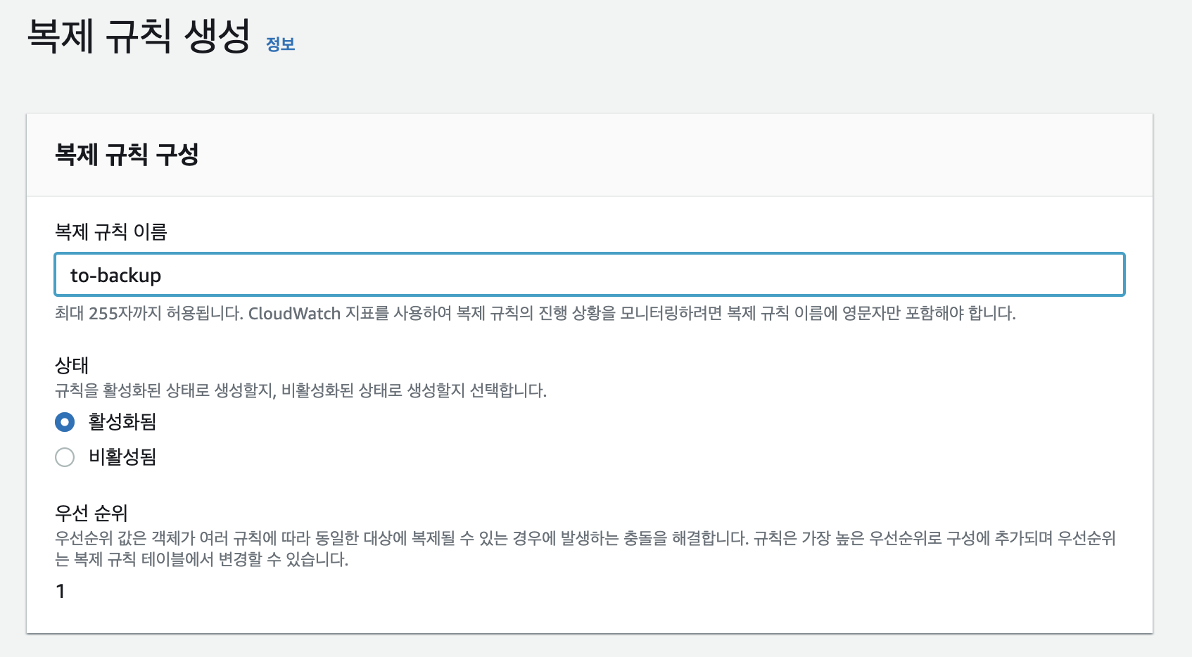 S3 복제를 하기 위해선 원본 버킷에 복제 규칙을 생성해야합니다.