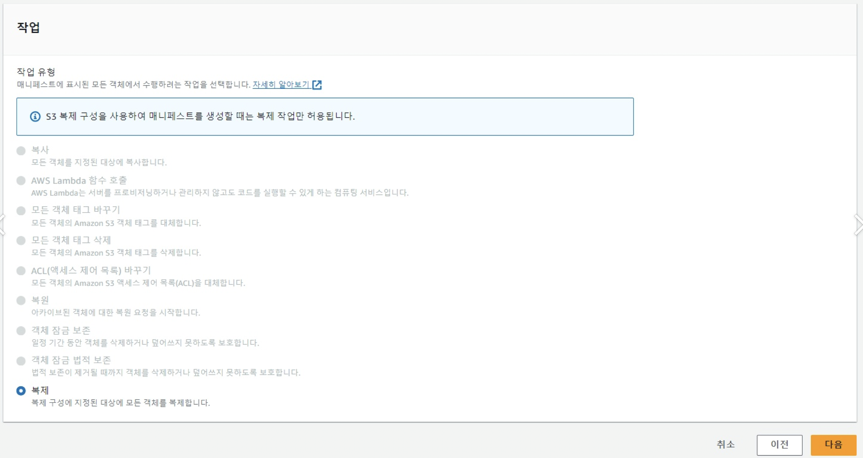 S3 복제 구성을 사용하였기에 매니페스트를 만들때는 '복제'만 사용 가능합니다.