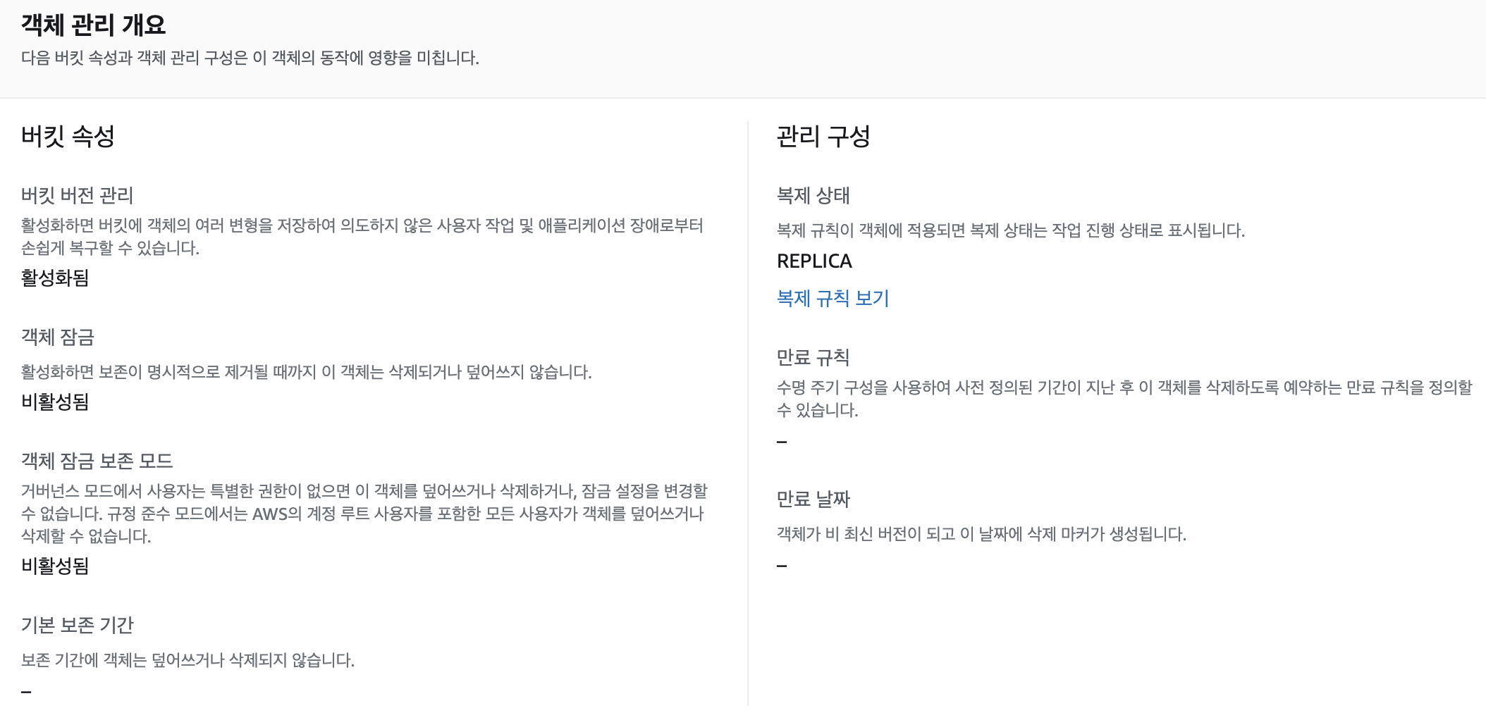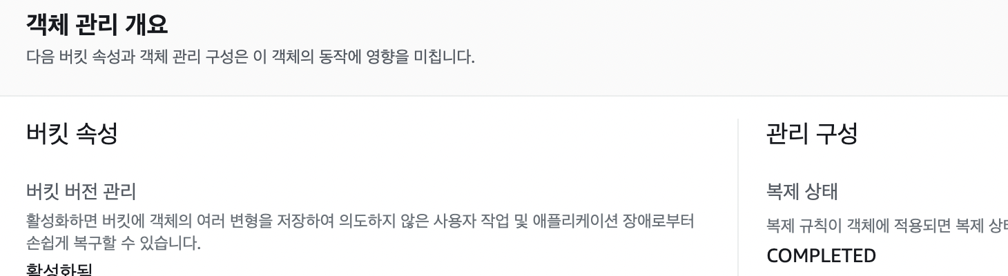 복제 규칙이 활성화된 버킷에 객체가 추가되면 관리 구성의 상태가 Pending이 되고 시간이 지나면 Completed 상태가 됩니다.