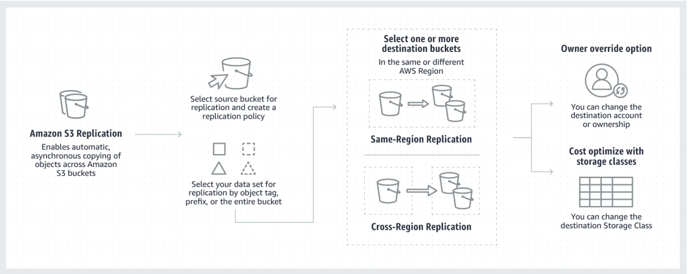 S3 복제를 사용하면 CRP (교차 리전 복제) 와 SRR (동일 리전 복제) 두가지 방법으로 S3 데이터를 복제 할 수 있습니다.