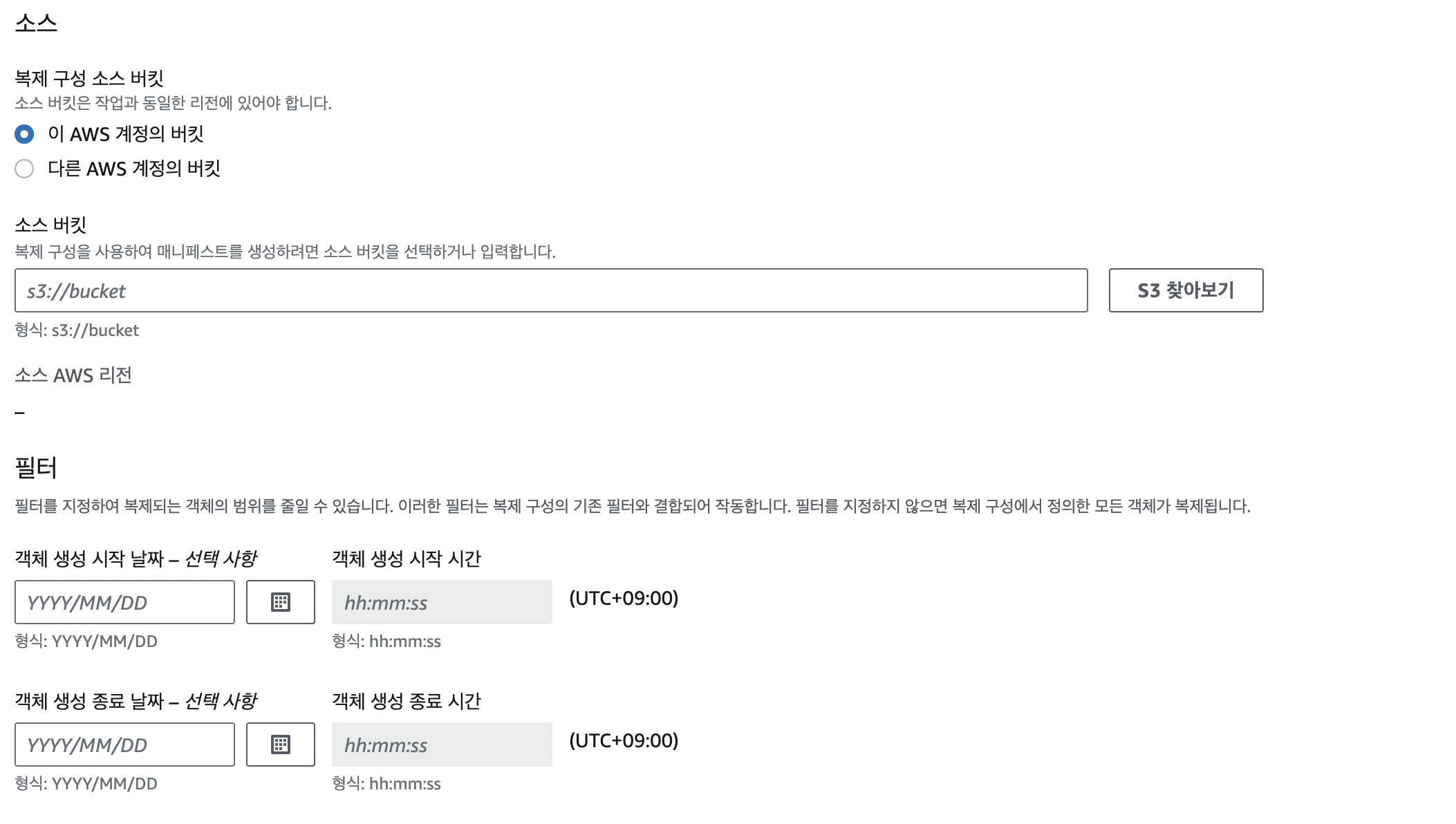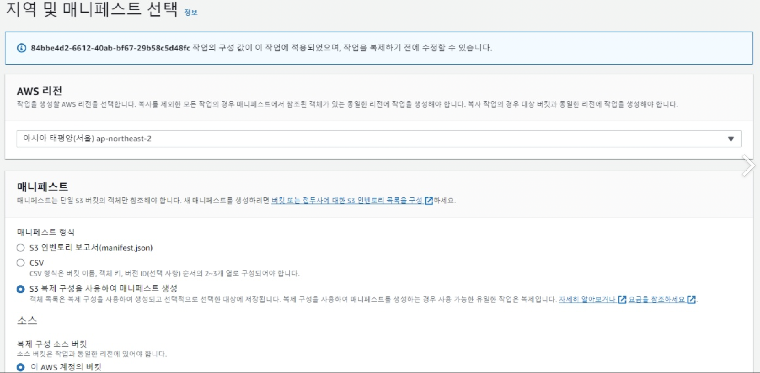 배치 작업을 진행할 목적지 버킷을 지정하고, 배치작업의 필터를 지정 가능합니다.