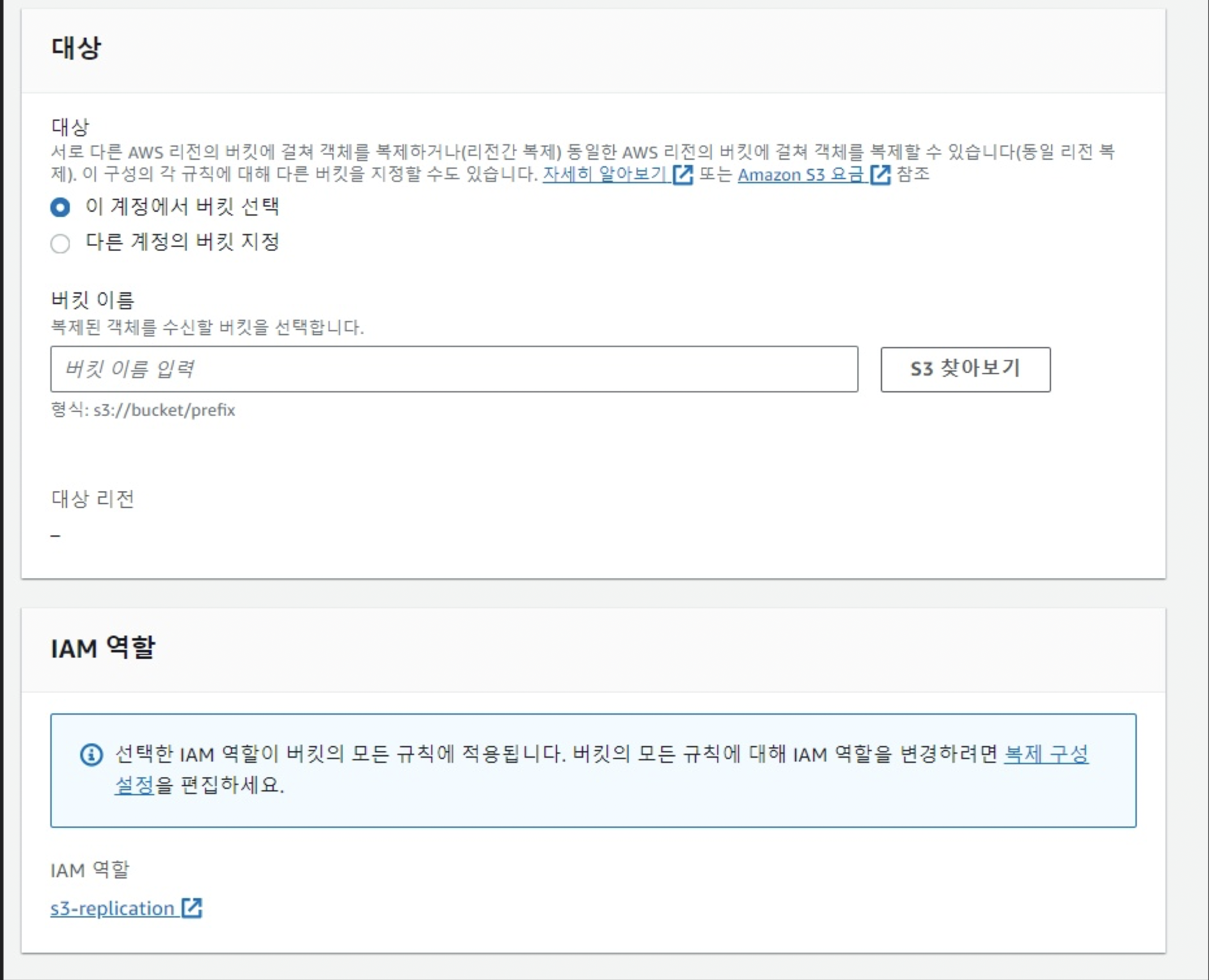 iam 역할은 원본 버킷과 목적지 버킷에 대한 권한이 모두 있어야 합니다.