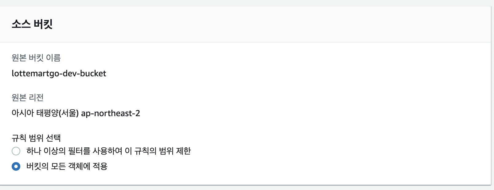 복제규칙을 만들어도 기존의 소스 버킷의 데이터들은 목적지 버킷에 존재하지 않습니다.