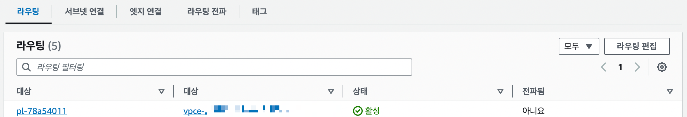 생성이 성공하면 서브넷의 라우팅 테이블에 라우팅이 추가되고,