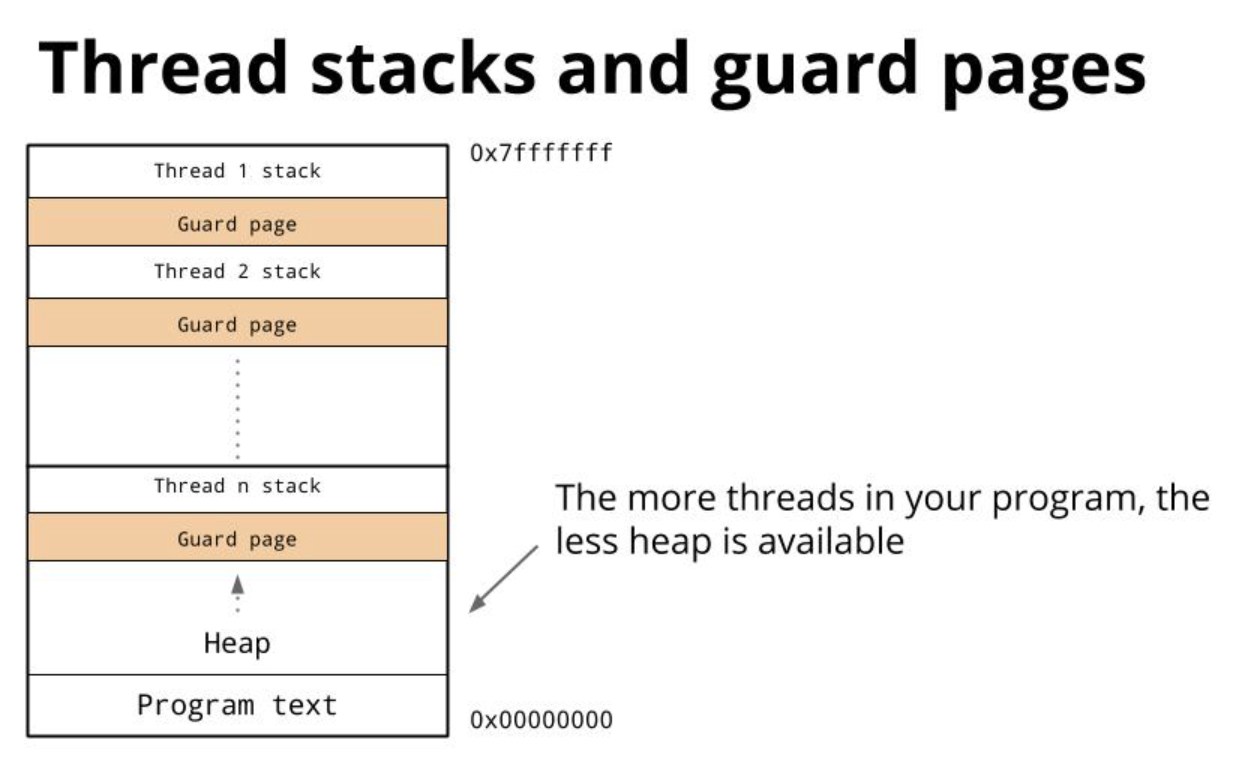 - 쓰레드는 사용할 메모리 공간과 각 메모리 간의 경계 역할을 하는 Guard Page라고 불리는 메모리 영역을 함께 필요로하여 약 1Mb의 메모리 공간을 소모하여 생성됩니다.