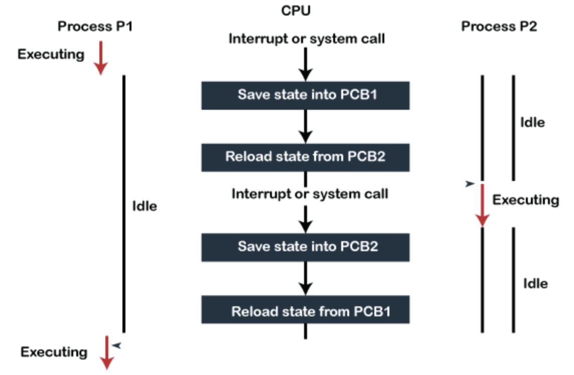 CPU에 할당된 '프로세스1'이 스케줄링을 통해 다른 프로세스 '프로세스2'로 변경될 때 실행되던 '프로세스1'의 정보를 '프로세스1'의 PCB에 저장하고 '프로세스2'를 CPU에 할당합니다. 이후 '프로세스2'의 PCB에 저장되어있던 '프로세스2'의 정보를 다시 불러온 다음, CPU가 '프로세스2'을 실행시킵니다.