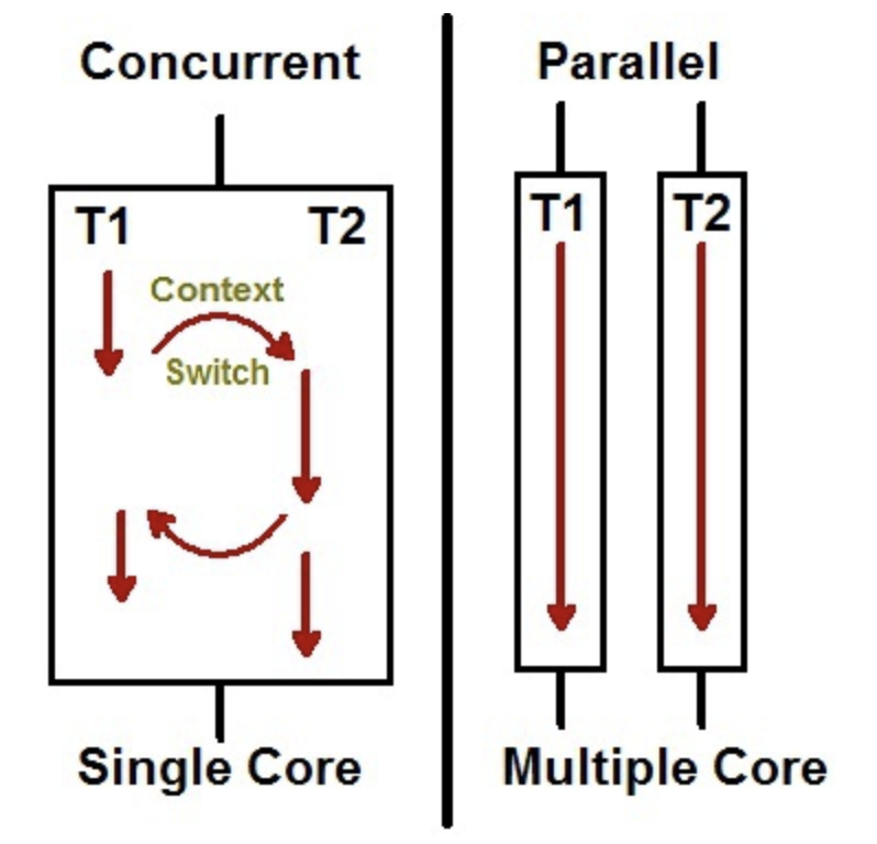위에서 동시성은 싱글코어, 벙렬성은 멀티코어에서 사용되는 것 처럼 이야기 했지만,