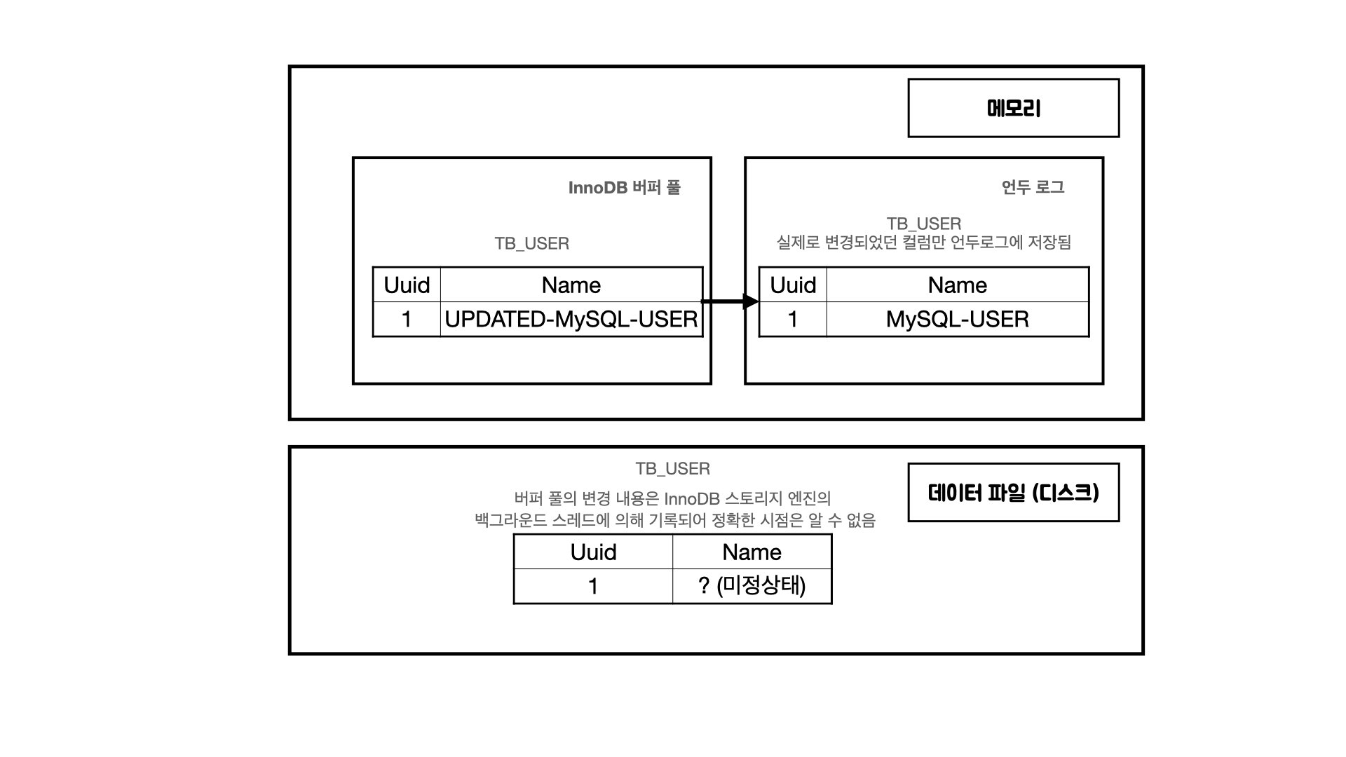 디스크에 변경을 기록하는건 InnoDB의 백그라운드 스레드 (Write Thread)가 작업하기에 UPDATE명령 후 바로 디스크에 업데이트 될 수도 있고 아닐 수도 있습니다.