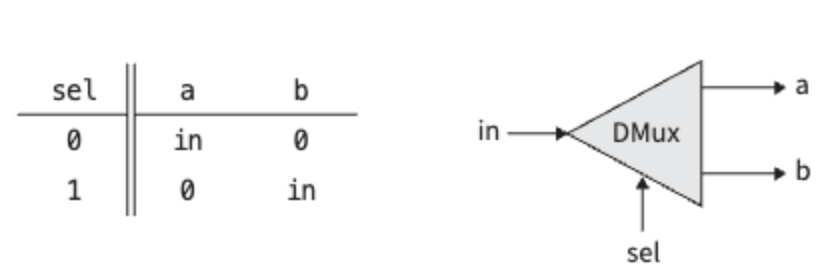 in과 입력신호(sel)를 각각 하나씩 받아서 2개의 출력(a,b)으로 전달하는데, 입력신호(sel)가 0이면 a에 in을 1이면 b에 in을 전달합니다.