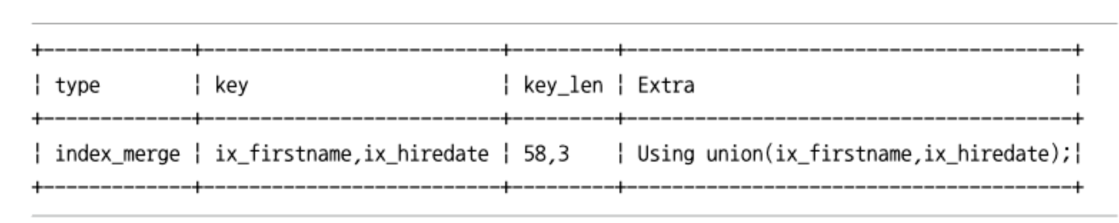 그럴 경우에는 중복 제거를 위해 정렬을 해야하는데 Index_merge_sort_union 방식의 sort_union 알고리즘을 사용하며