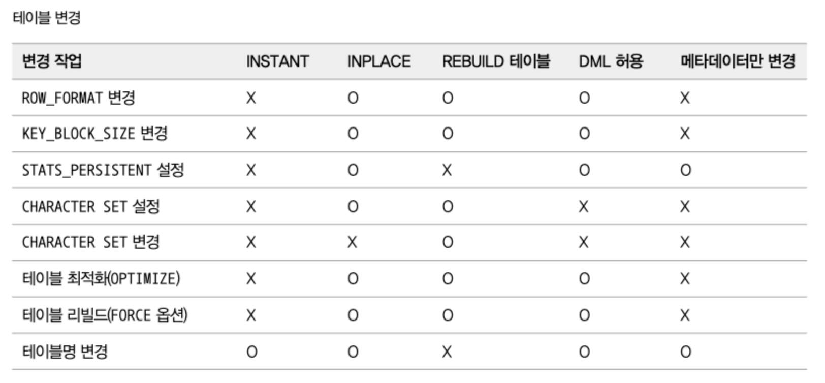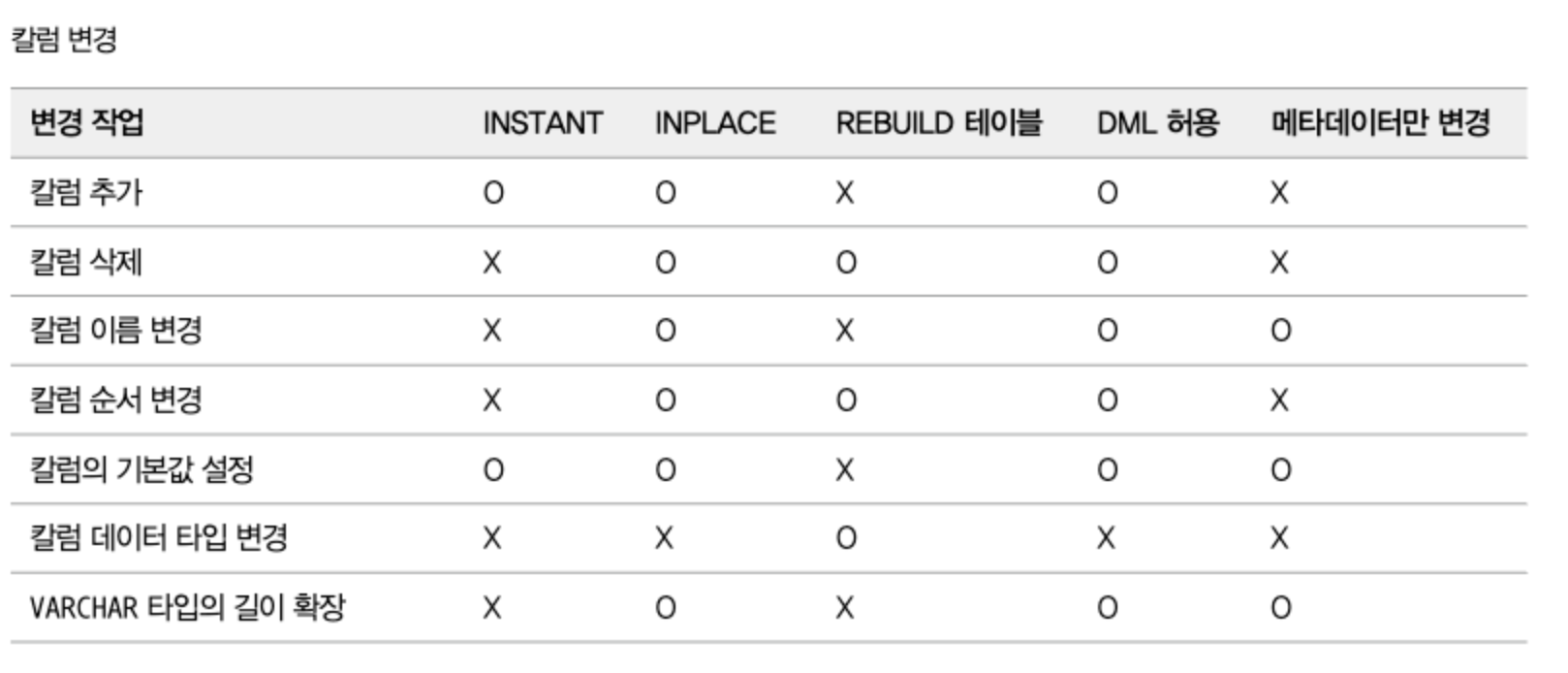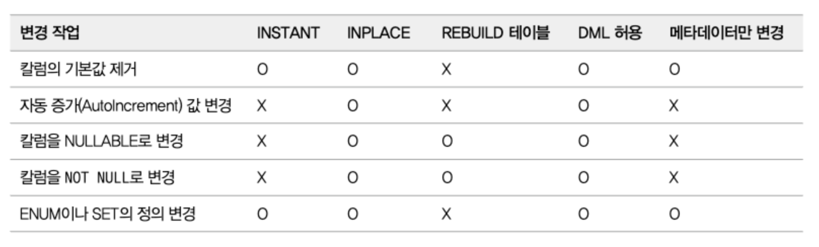 3가지의 알고리즘이 존재하며, ALTER TABLE 실행하면 MySQL은 INSTANT, INPLACE, COPY 순서대로 가능한 알고리즘을 선택하여 적용시킵니다.