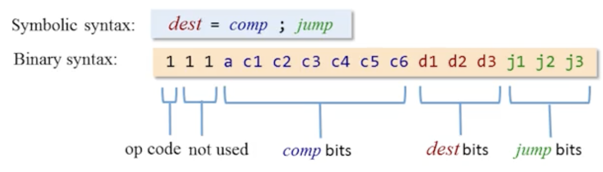 무었을 계산할지 (comp), 어디에 계산된 값을 저장할지(dest), 그 다음 무엇을 할지(jump)에 대한 명령어입니다.