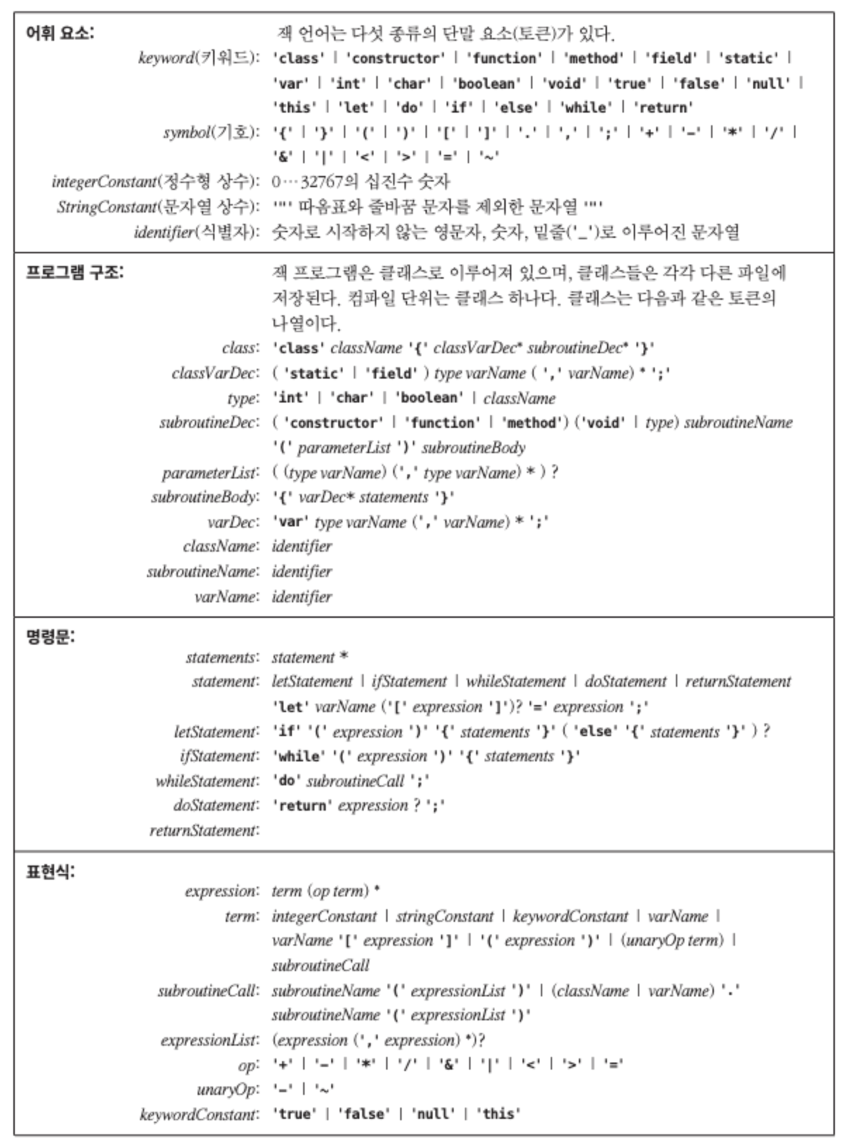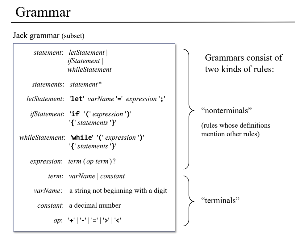 jack 언어의 문법은 아래와 같은 문법을 따르며