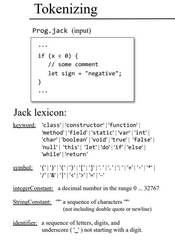 아래 그림에서 jack언어의 어휘(lexcion)들과 일반적인 코드들이 어떻게 처리되는지 볼 수 있습니다.