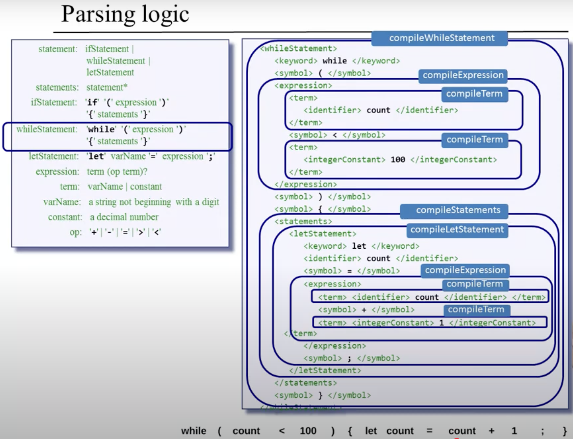 저 compileWhileState()메소드 안에는 아래 그림처럼 재귀적으로 각 구문들을 처리하는 함수들이 필요합니다.