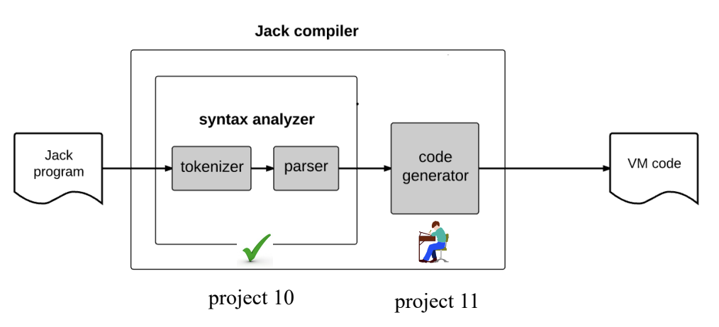 잭 컴파일러는 jack 코드를 vm 코드로 변환합니다.