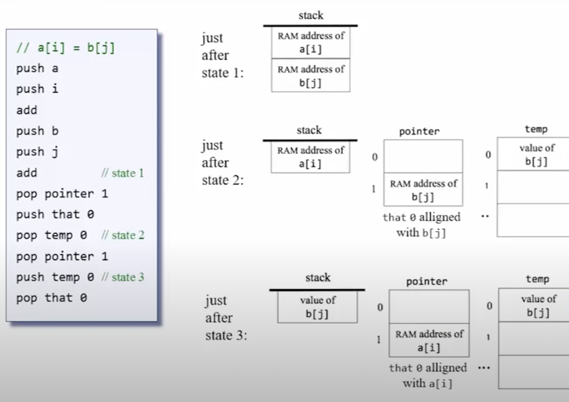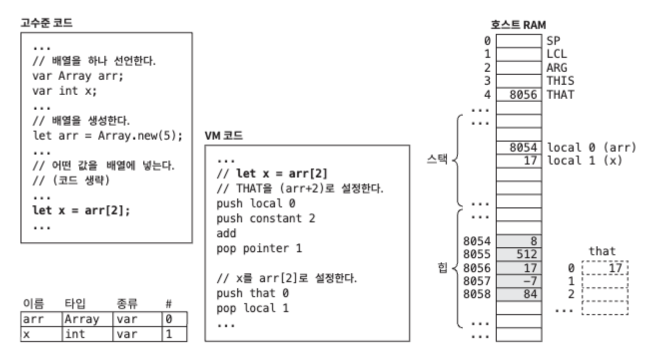 고수준 언어는 객체와 배열등 다양한 추상적 개념들이 있지만 컴파일러의 vm코드에서는 스택과 가상 세그먼트만 사용 가능합니다.