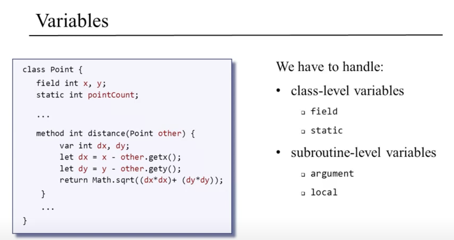 jack파일에는 여러 종류의 변수들과 scope가 존재하는데 클래스가 컴파일될때 클래스레벨 변수와 서브루틴 레벨 변수를 나누어 테이블을 생성하고 각 변수에 실행 인덱스를 제공합니다.