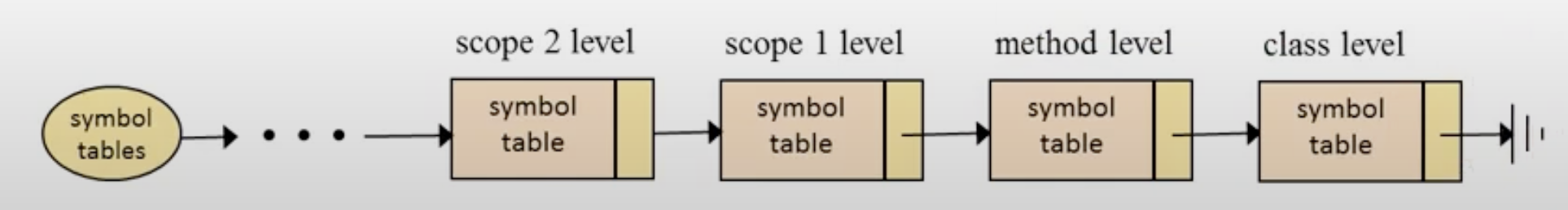 컴파일러는 symbol table들을 LinkedList로 연결하여 사용하고있기에 현재 범위와 관련된 테이블에서 값을 찾고 관련 테이블에서 그 값을 찾지 못하면 리스트의 다음 테이블에서 찾는 방식으로 찾아나갑니다.