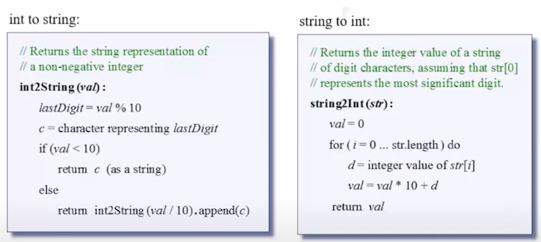 int2String()은 숫자를 재귀적으로 문자열로 변환하고,