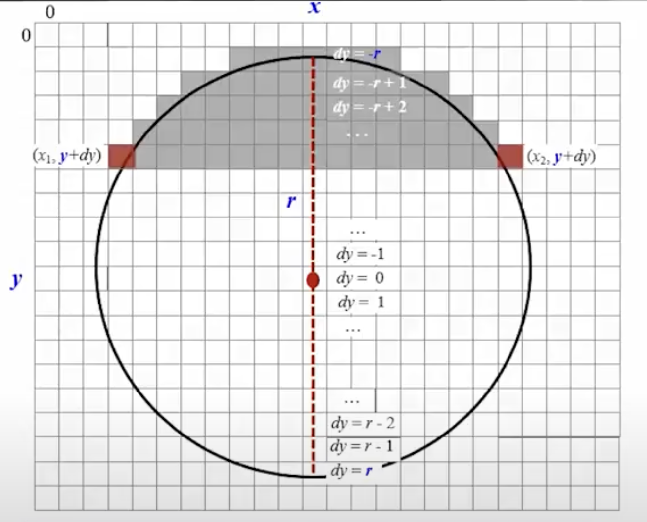 중심의 좌표 x,y와 원의 반지름 r을 argument로 받고, y+dy, x를 지나는 선들을 이용해 원을 그립니다.
