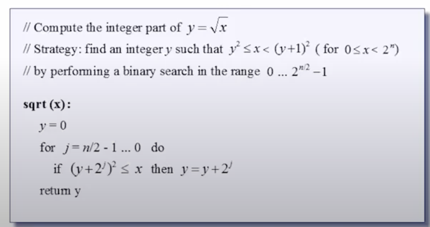 y = √x을 구하는 것은 y² ≤ x < (y + 1)²인 값을 찾는 것과 같습니다.