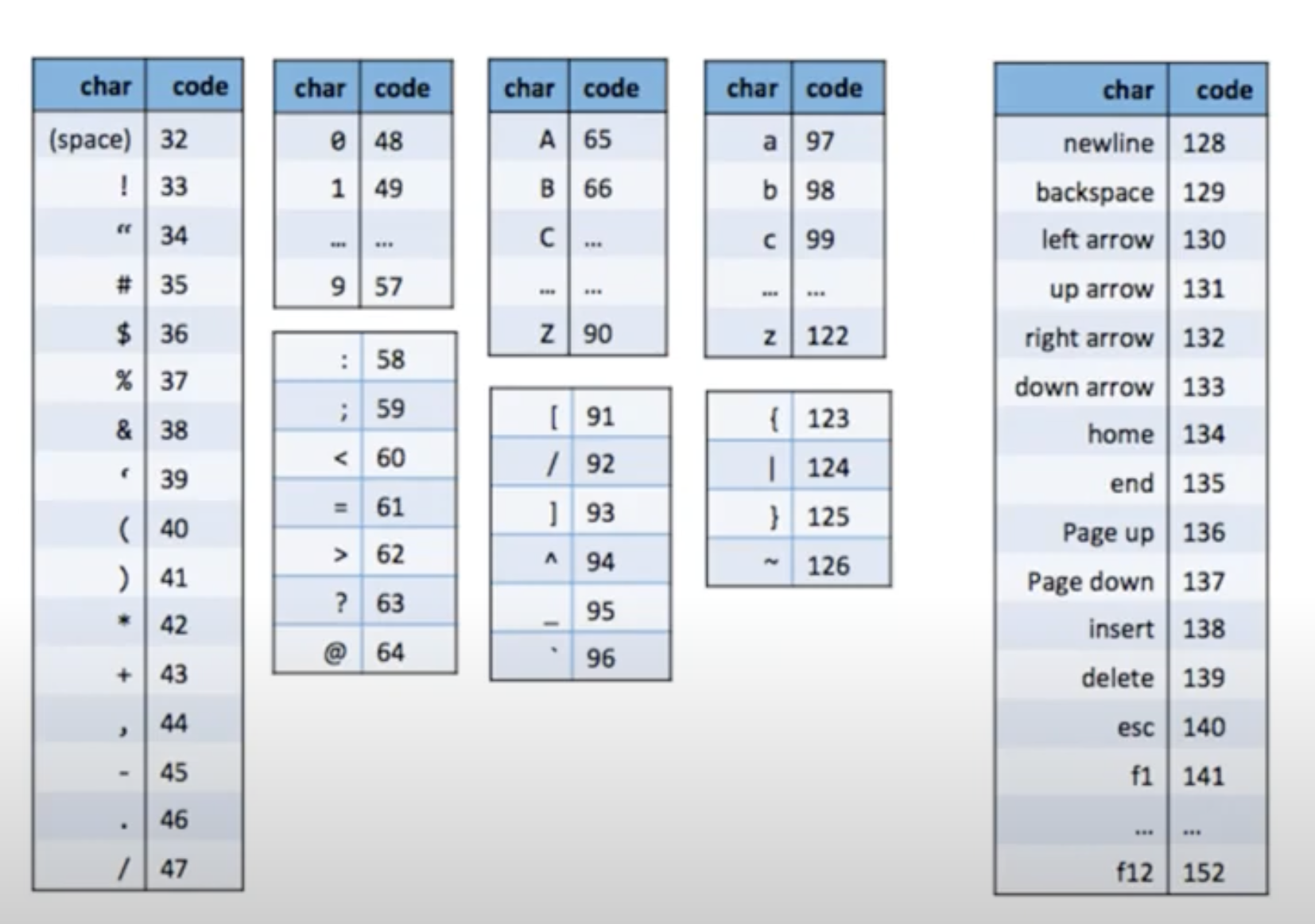아래 표는 keyboard에서 사용하는 아스키코드값입니다.