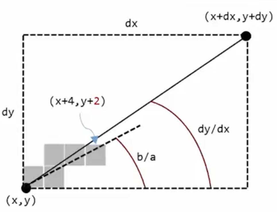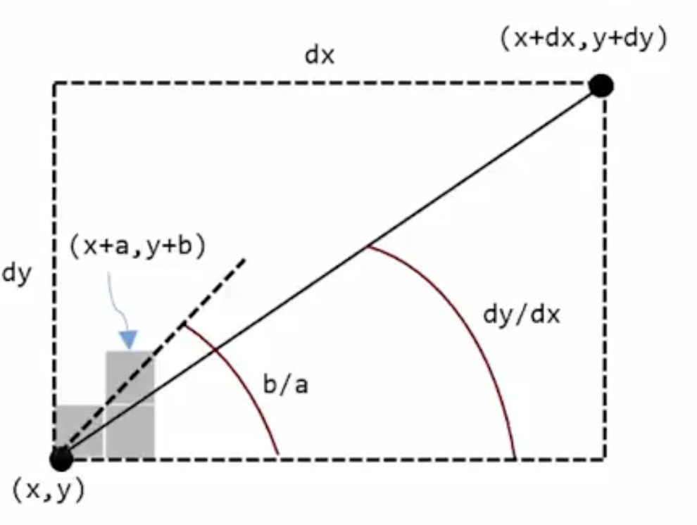 b/a가 dy/dx보다 크다면 오른쪽으로 아니라면 위쪽으로 이동합니다.